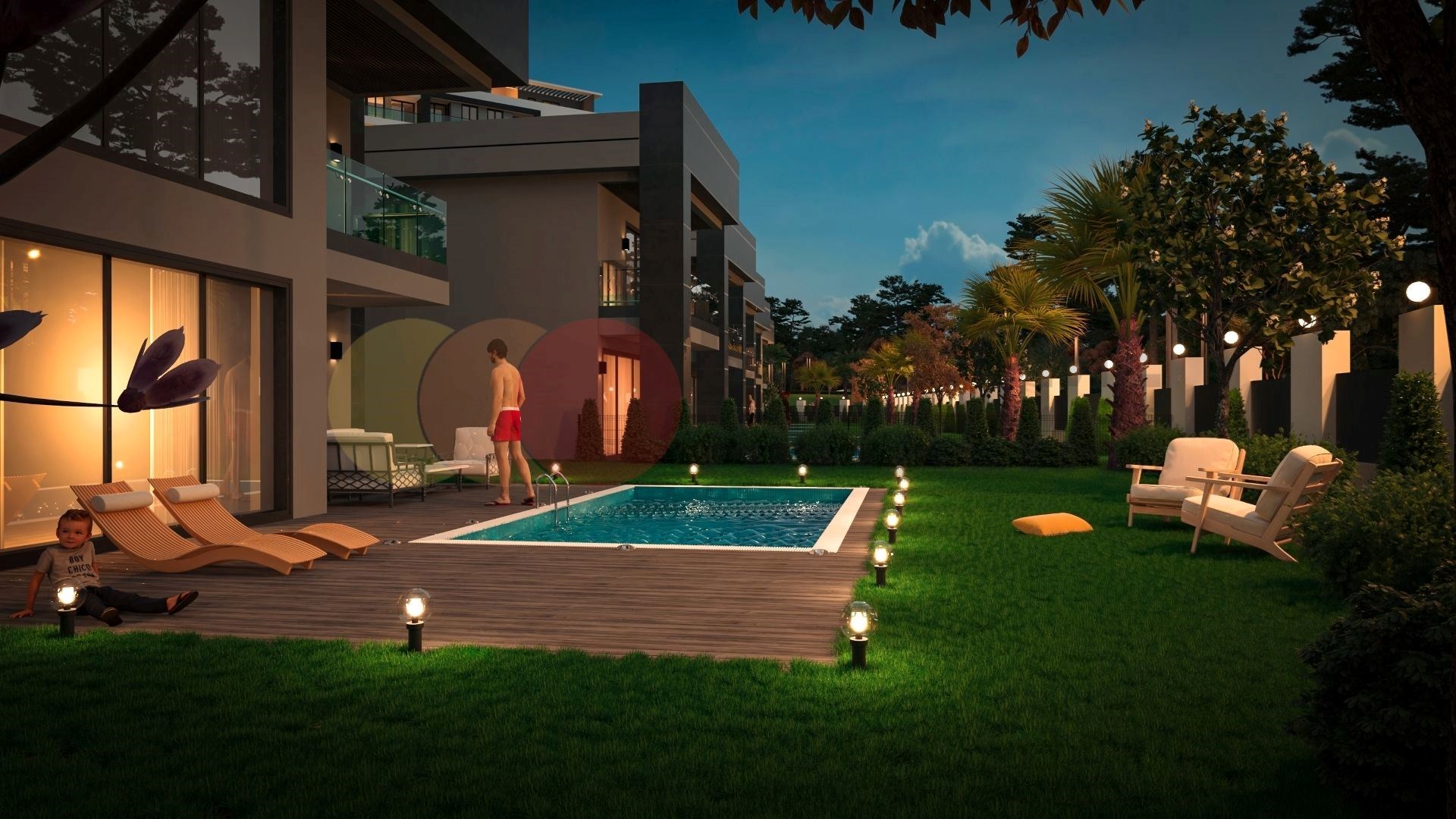 In 5 bedroom villas, in addition to all the features of the apartments, there is its own private swimming pool, parking lot, garden, fitness, sauna, Turkish bath, massage room and hobbyroom.